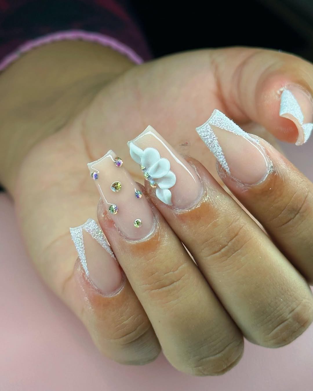 Nothing says “beach bride but make it glam” like these sculpted white French tips with 3D petals and sparkly stones. The mix of matte and shimmer textures adds that soft-sand-meets-seafoam magic, while the floral accent brings a bridal touch straight out of a destination wedding catalog.