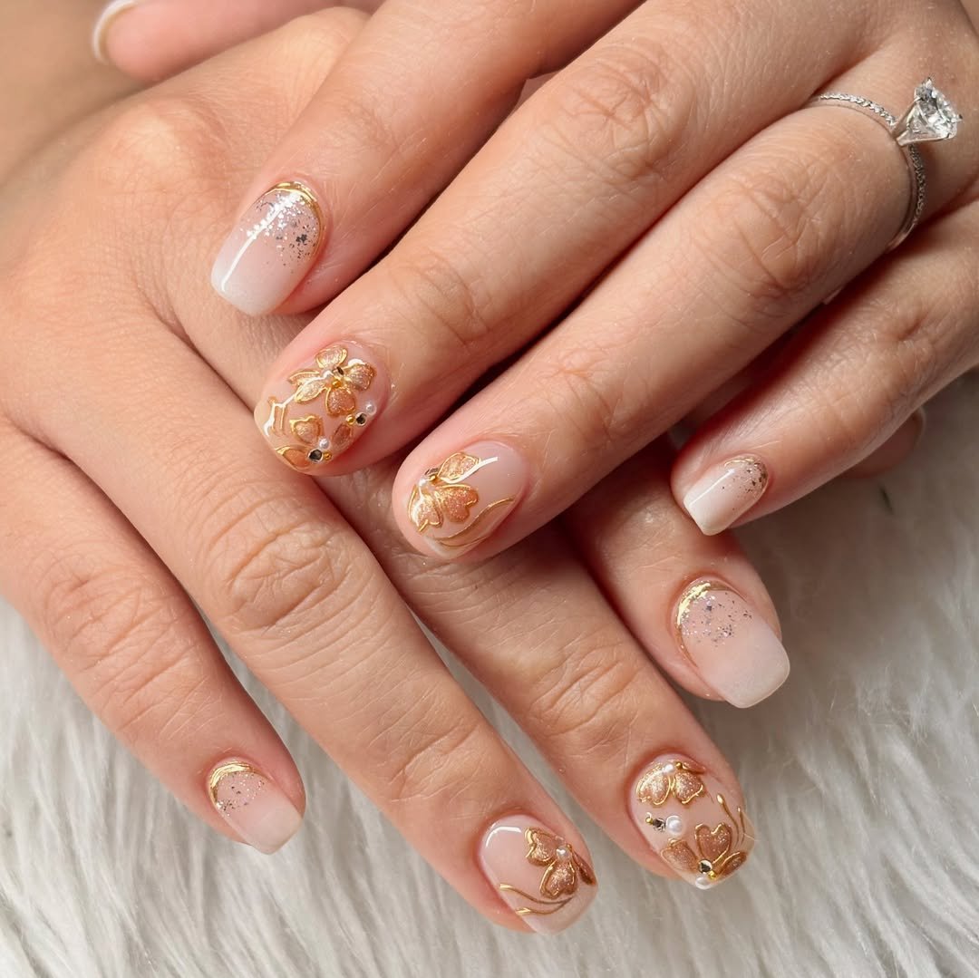 These florals feel like they were sun-kissed themselves. The gold detailing gives a warm, glowing touch that feels perfect for a sunset ceremony. Soft glitter on a neutral base adds that tiny sparkle without overpowering anything.
