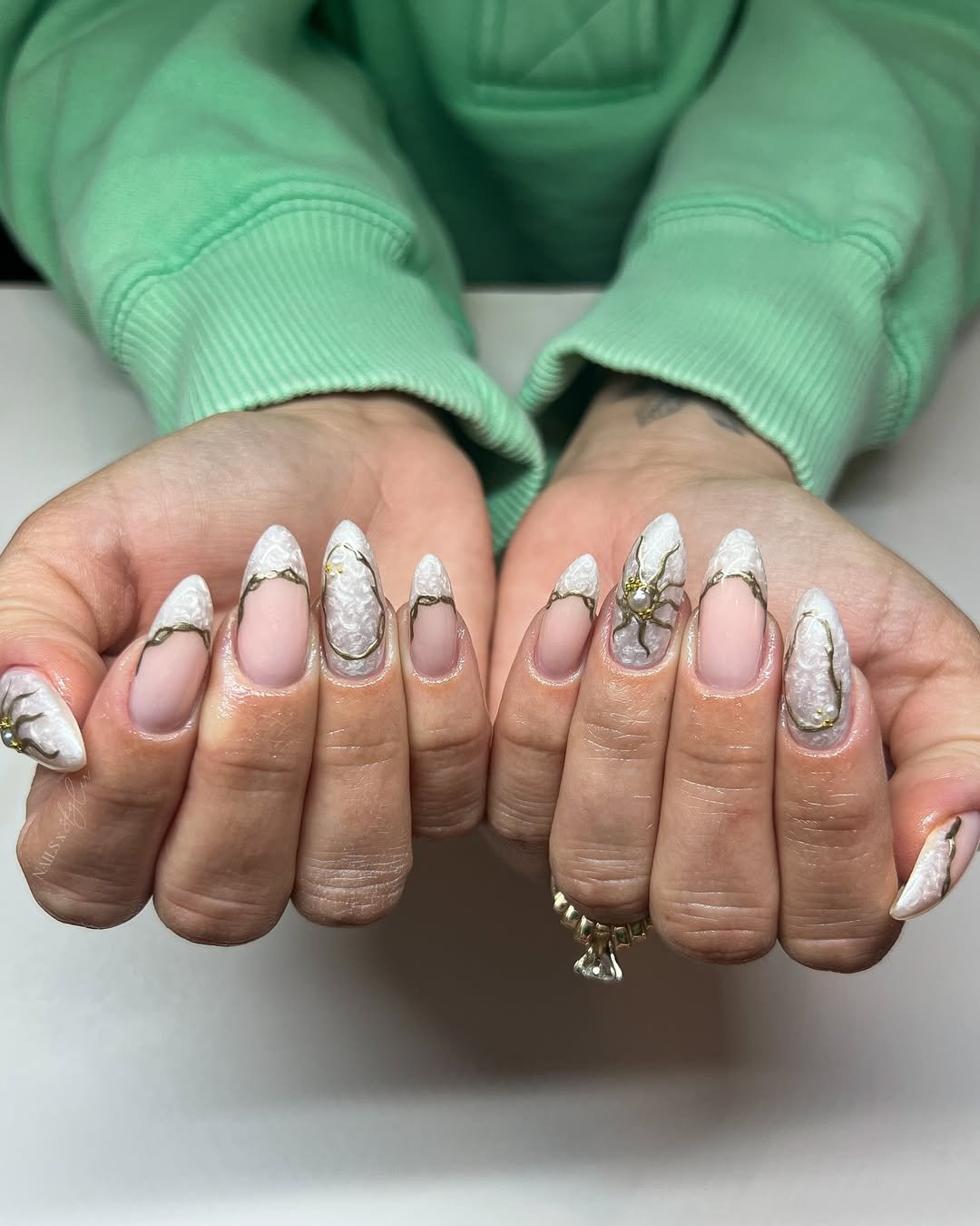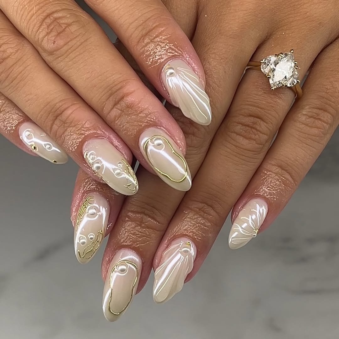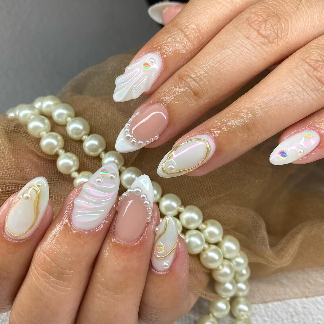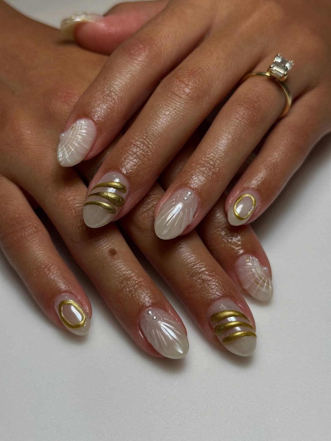 These nails look like hand-carved seashells you’d find in a boutique tucked away on a hidden island. The 3D textures, the milky whites, the tiny gold accents — it’s giving mermaid royalty.