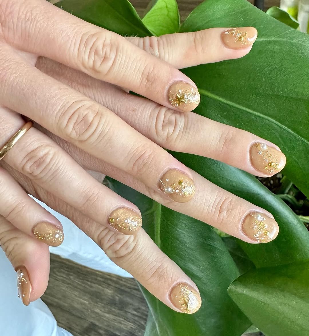 Warm sandy beige topped with gold flecks — these nails look like sunlight reflecting off wet sand. It’s subtle sparkle without the glitter overload, and that restraint makes it super chic.