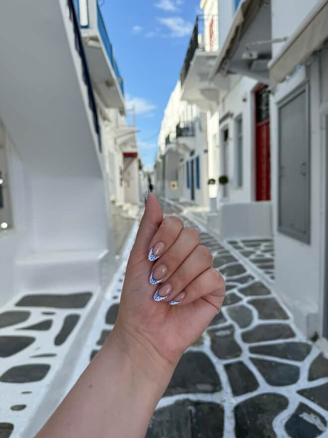 This manicure feels like a stroll through whitewashed Greek alleys — crisp, bright, and perfectly minimal. The tiny blue accents along the French tips add just enough color to tie in your beach theme without going bold.