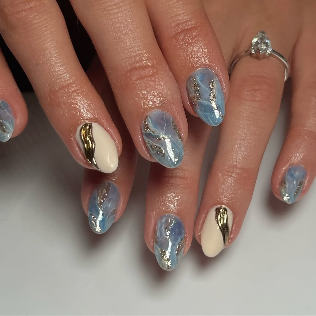 These nails look like someone bottled the ocean and painted it straight on. The glossy aqua swirls instantly scream destination wedding, and honestly, it’s impossible not to smile looking at them.
