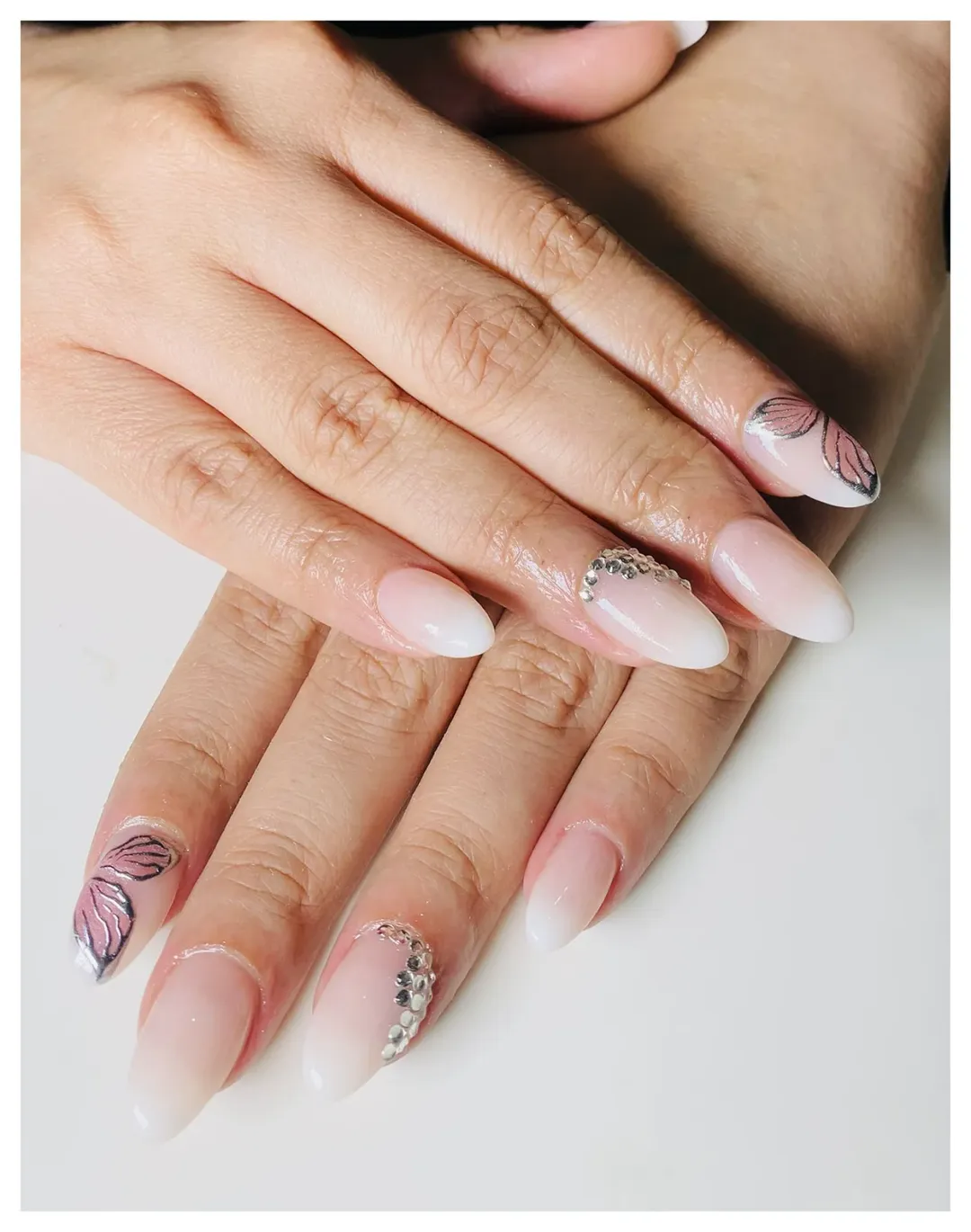 A blushy gradient topped with silver accents and soft petal details — this is the elegant bride’s beach nail. The look is subtle but carries that whisper of sophistication that never goes unnoticed.