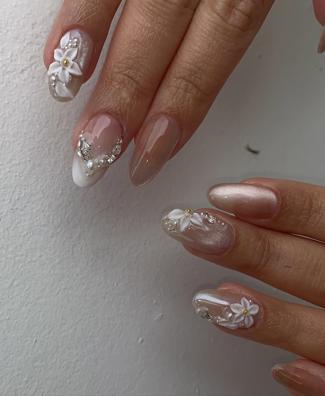 Pearlescent tones and raised 3D florals make this set feel luxe and luminous. Each nail looks like a tiny keepsake shell lined with treasures, perfect for a romantic beachfront ceremony.