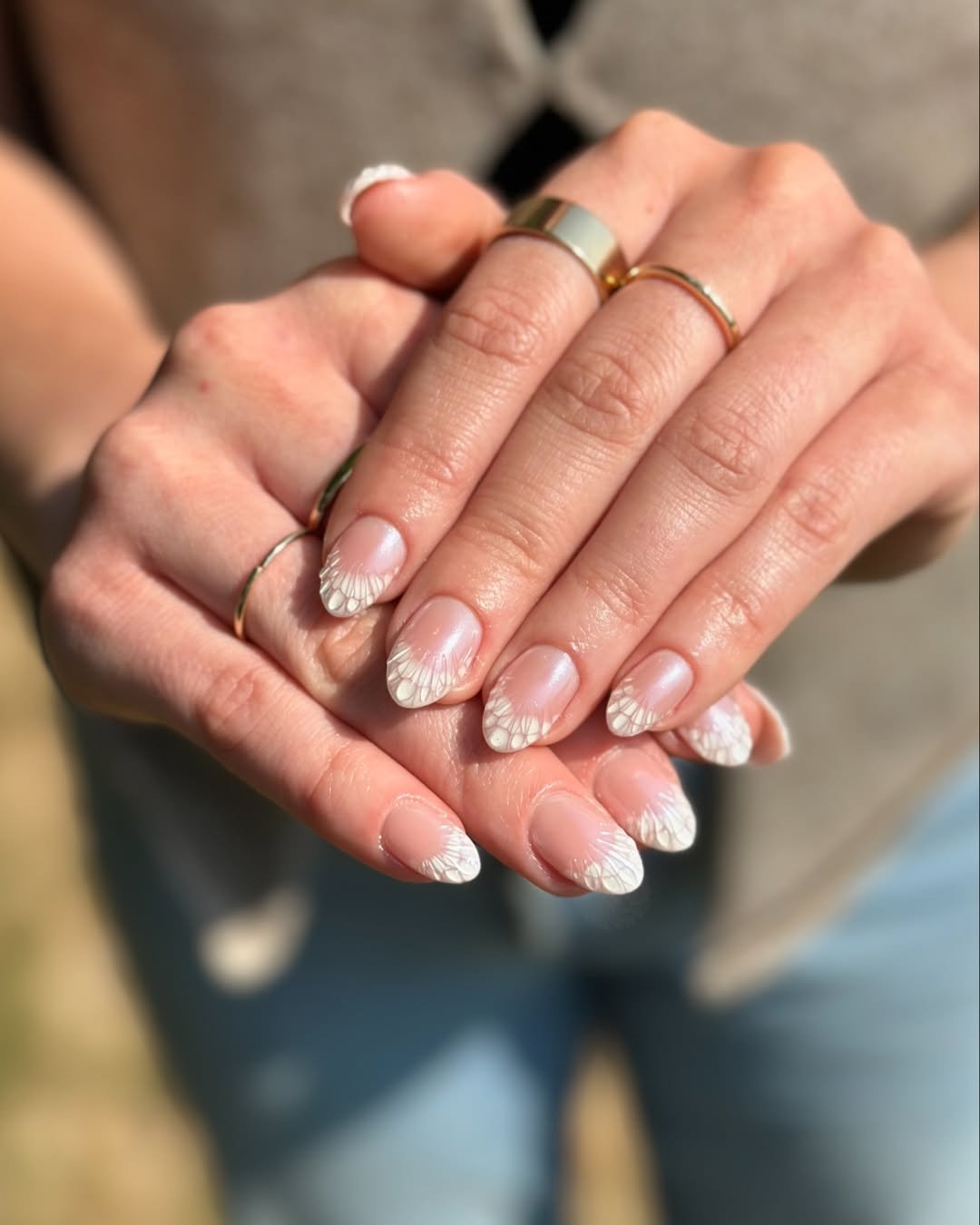 Think of these as tiny seashell petals washed ashore. The delicate white floral tips over a translucent pink base give “effortless coastal romance,” the kind of mani that photographs beautifully at golden hour.