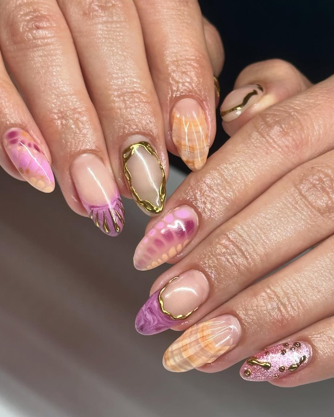 Pastels, seashell textures, gold outlines—this is literally the beach at golden hour but turned into a manicure. Every nail tells a different seaside story, from conch-shell swirls to warm waves of pink and sand-toned gradients.