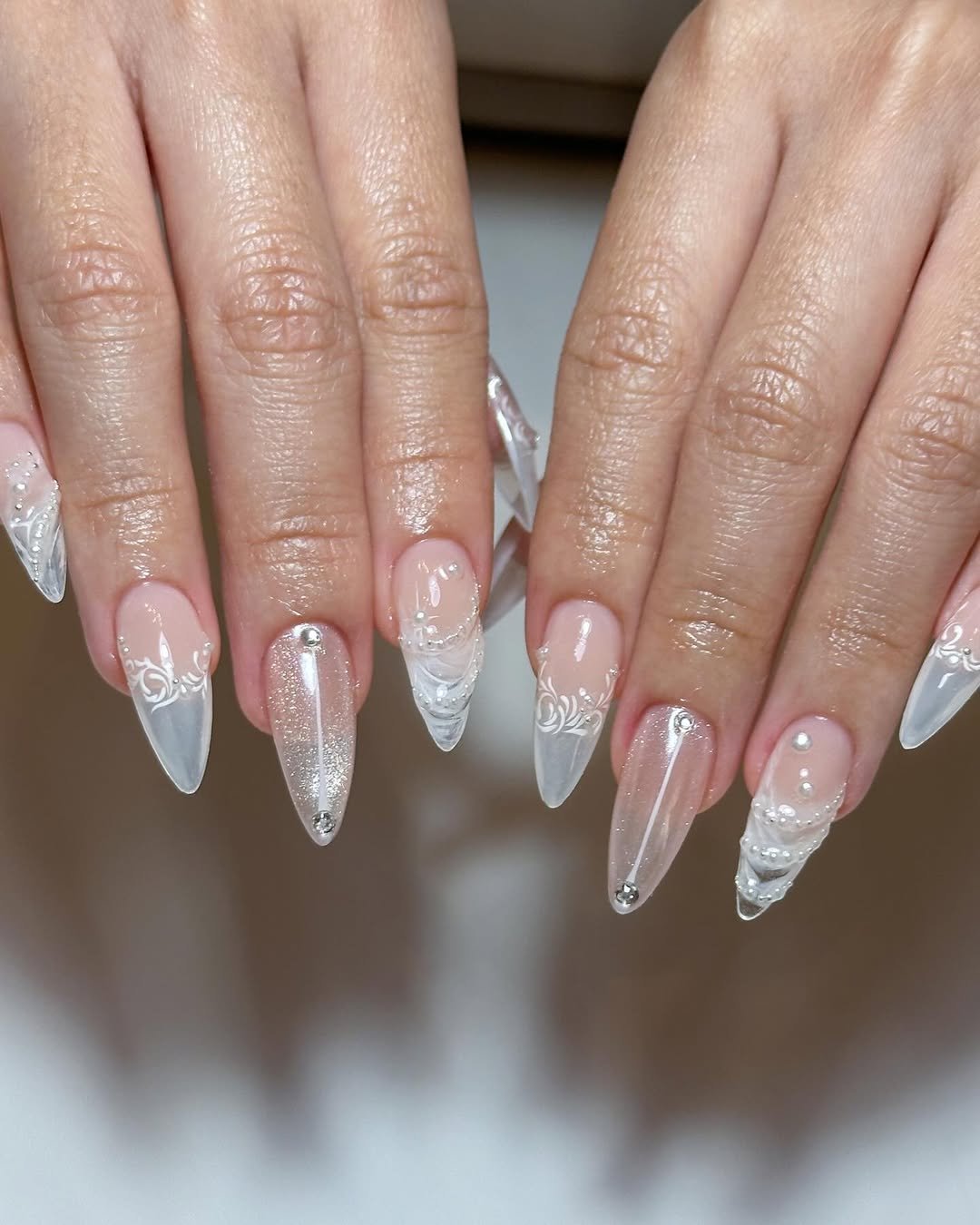 Sculpted tips, shimmering accents, and dainty detailing — this set is for the bride who loves drama but wants it ocean-washed and elegant. The translucent tips feel like sea glass catching sunlight.