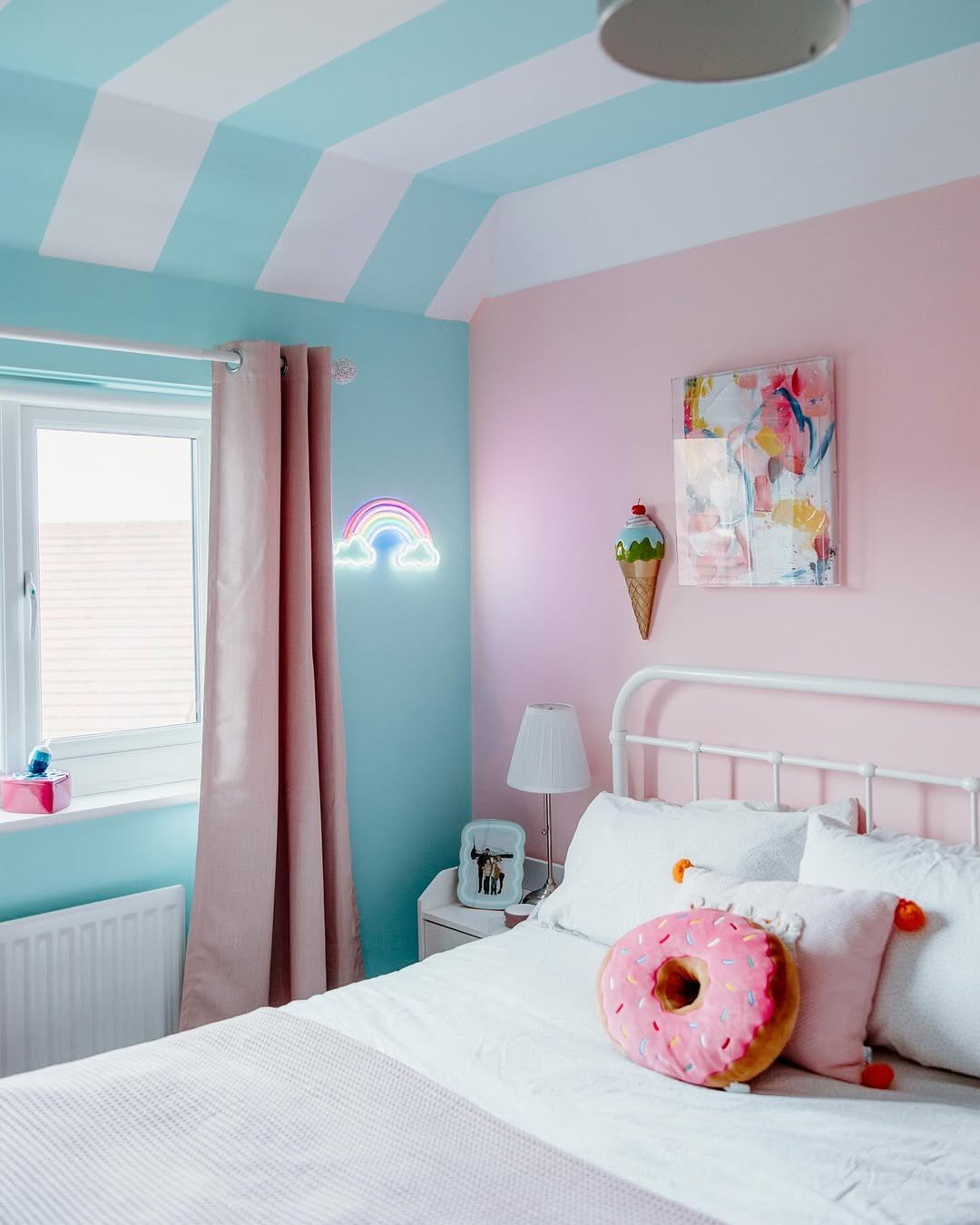 There’s a playful rhythm here that feels straight out of a daydream. The split of soft aqua and blush pink, paired with striped ceilings, creates a space that feels whimsical without tipping into chaos.