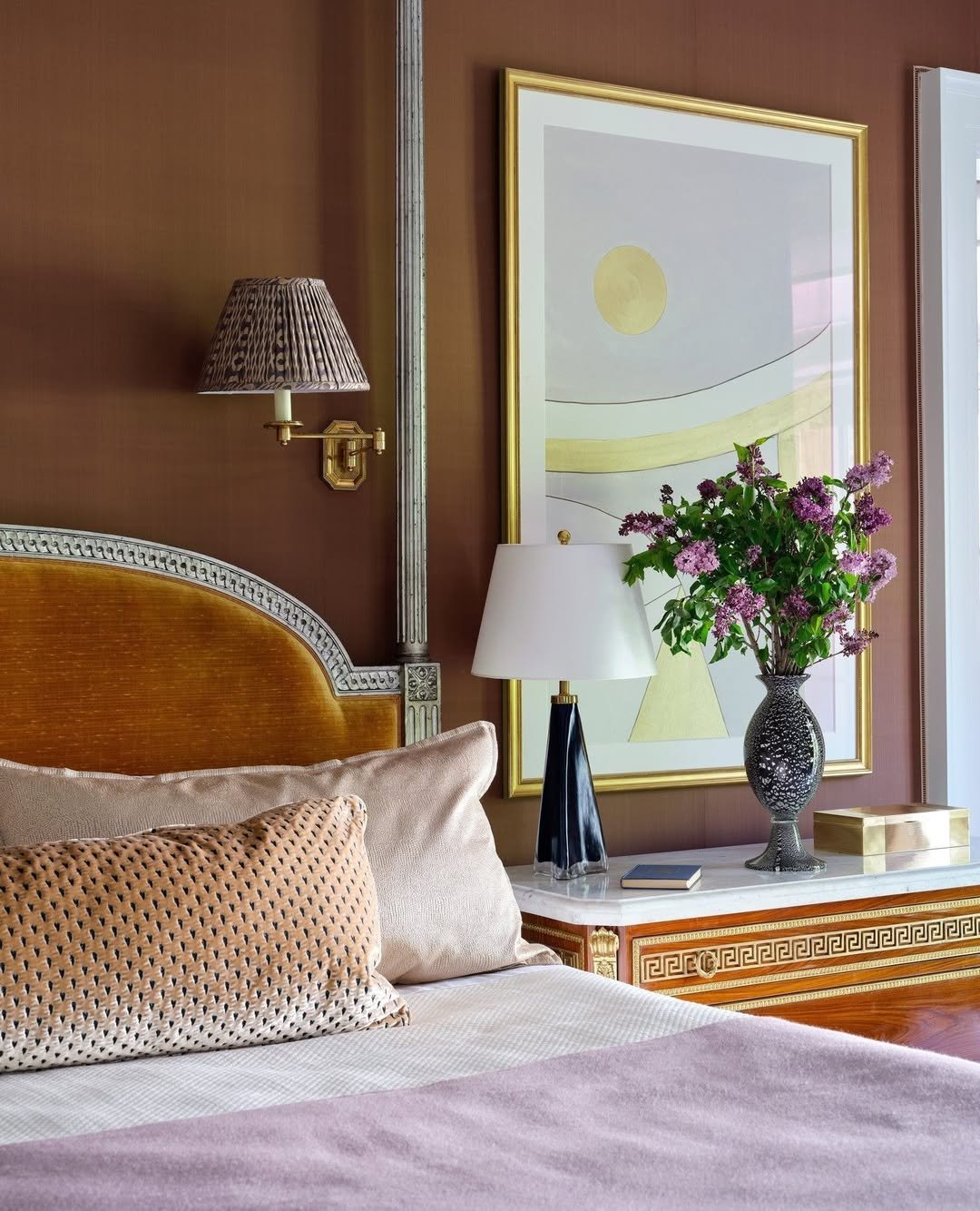 This room feels timeless in the best way. Rich brown walls, warm gold accents, and soft blush textiles create a palette that feels layered and quietly luxurious.