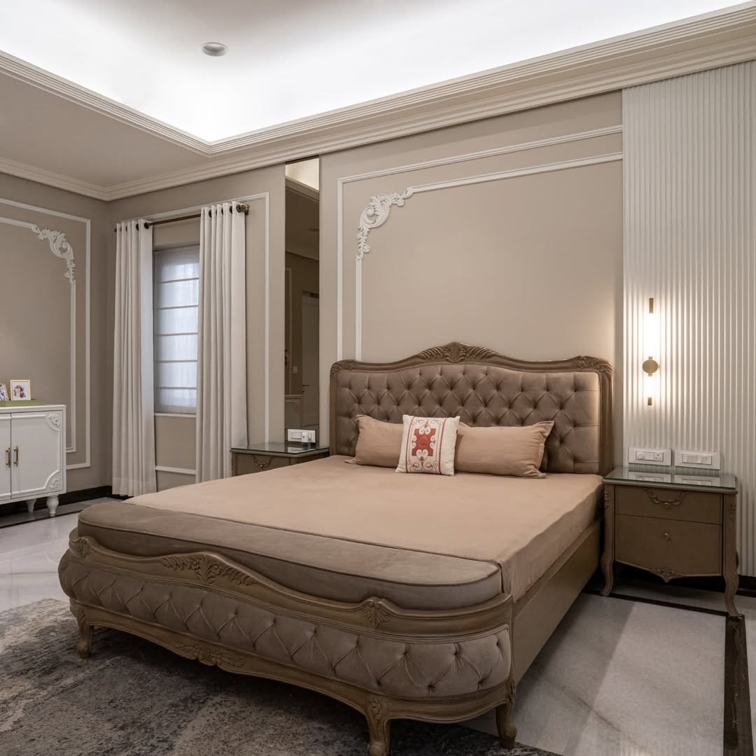 This space leans into tradition with a softer touch. The tufted bed, ornate molding, and warm taupe palette create a look that feels refined but still inviting.