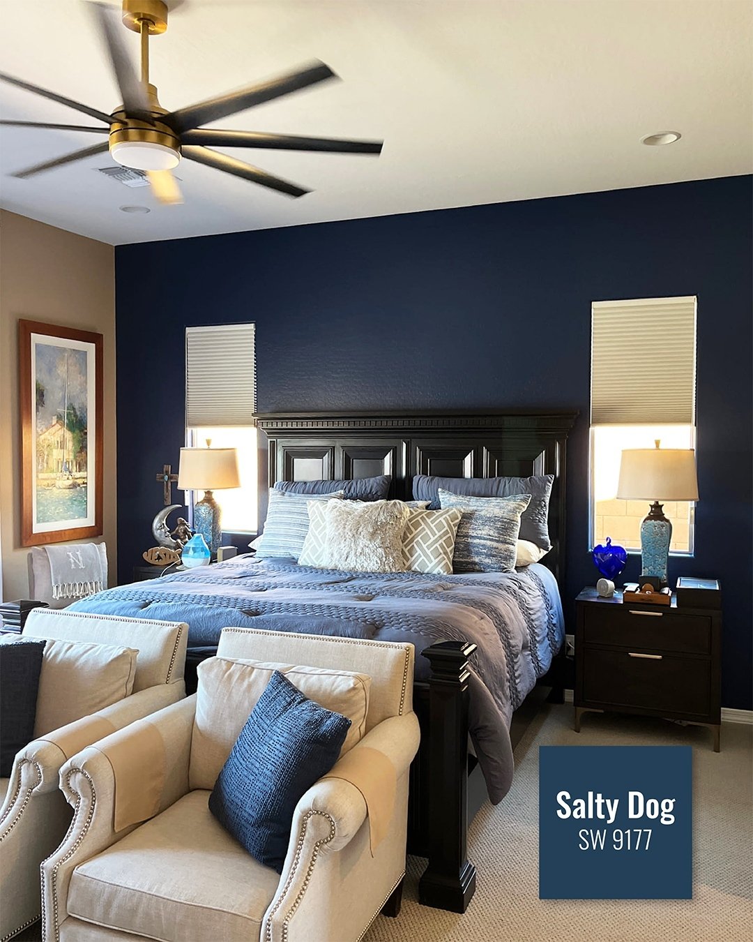 This space leans into that rich, enveloping navy in the most confident way. The “Salty Dog” tone wraps the room like a cocoon, grounding everything from the crisp bedding to the warm wood furniture. It feels tailored, almost like a perfectly fitted blazer translated into a bedroom.