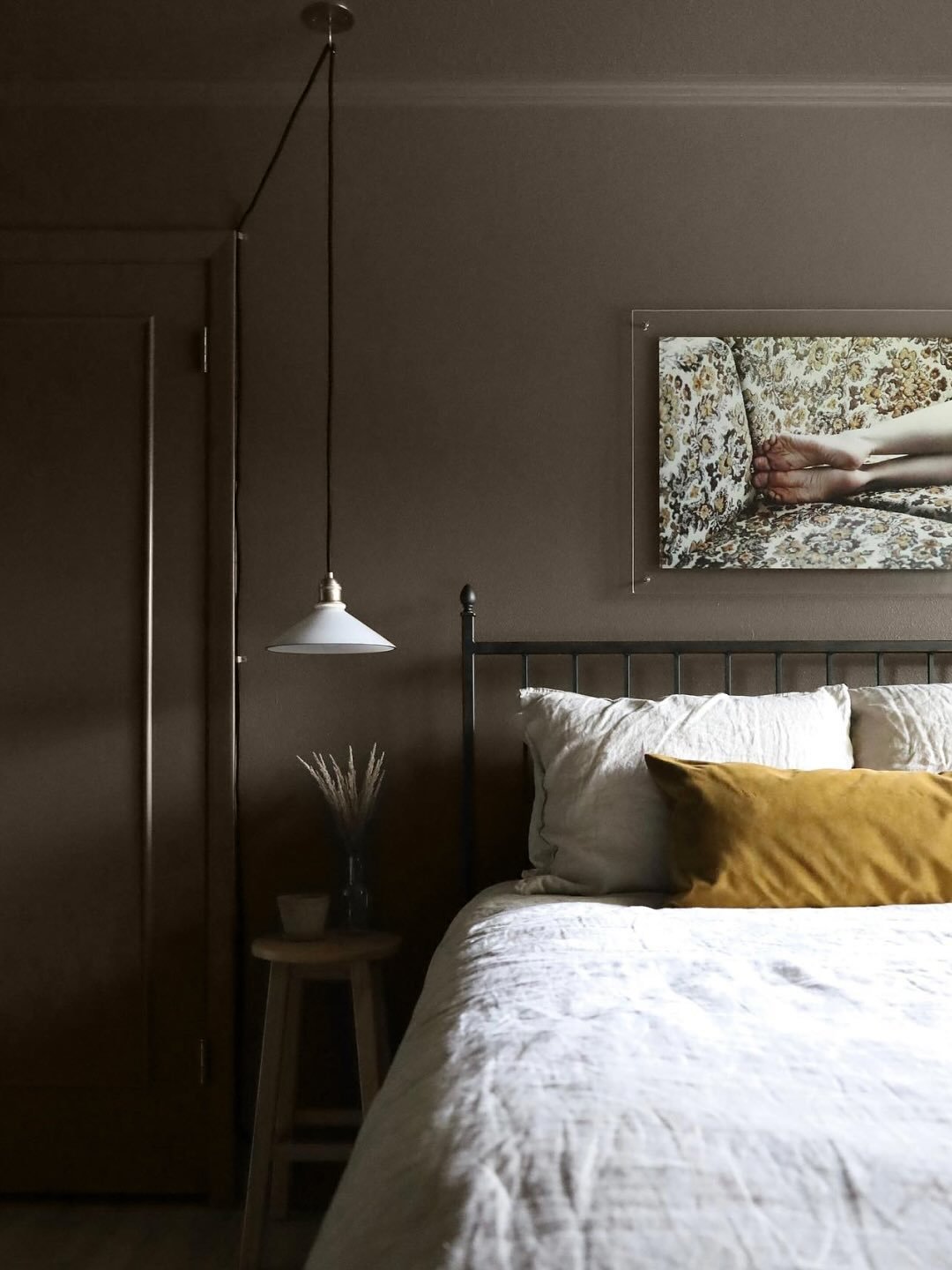 This room leans into warmth in the most grounding way. The mocha-toned walls wrap around the space, creating a cozy, almost hushed atmosphere.