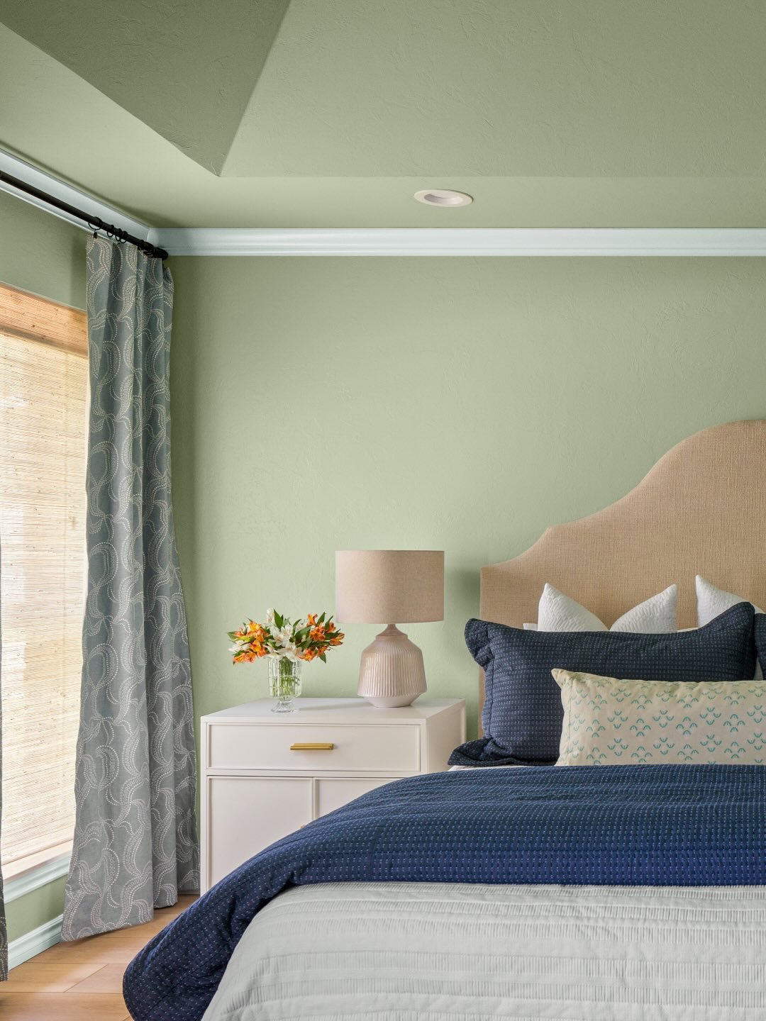 The muted green works almost like a neutral, especially when paired with linen textures and soft lighting. Perfect if you want color without losing that calm, restful feel.
