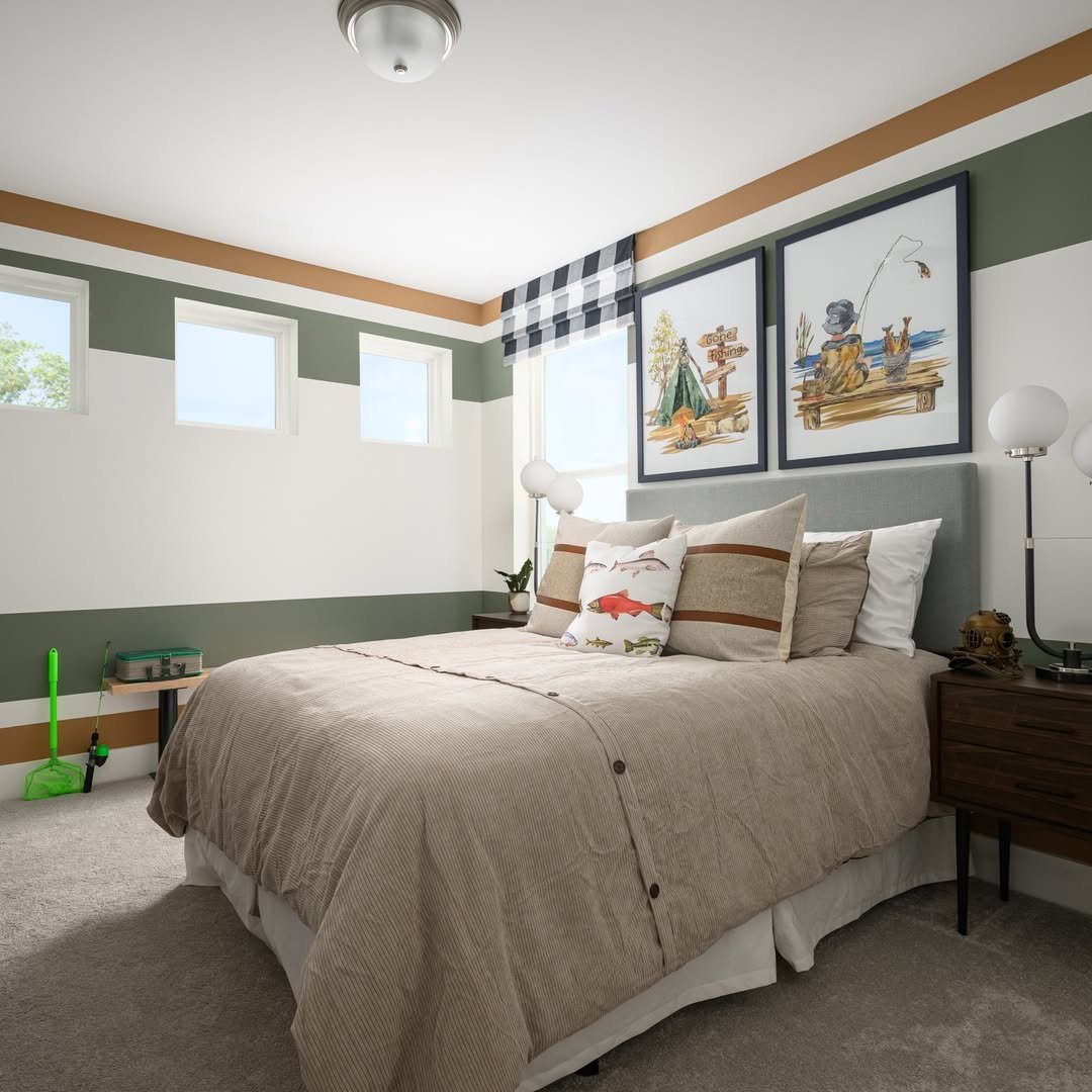 This room brings in a more structured, graphic approach to color. The green and tan stripes add movement, while the neutral bedding keeps things grounded.