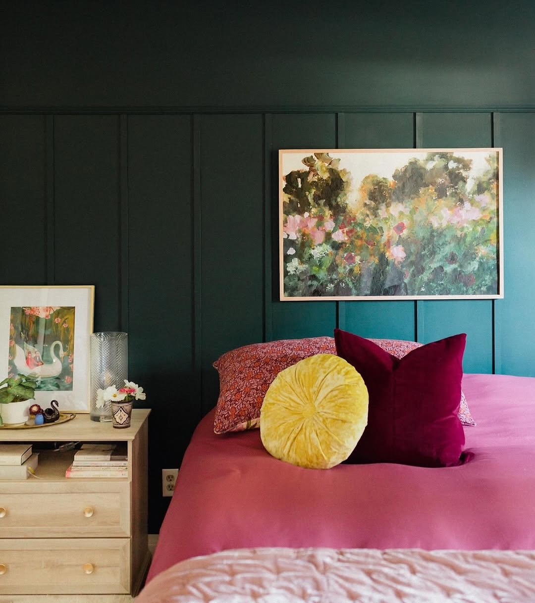 This room leans into color with intention. That deep teal backdrop sets the stage for warm berry tones and golden accents, almost like a painting brought to life.