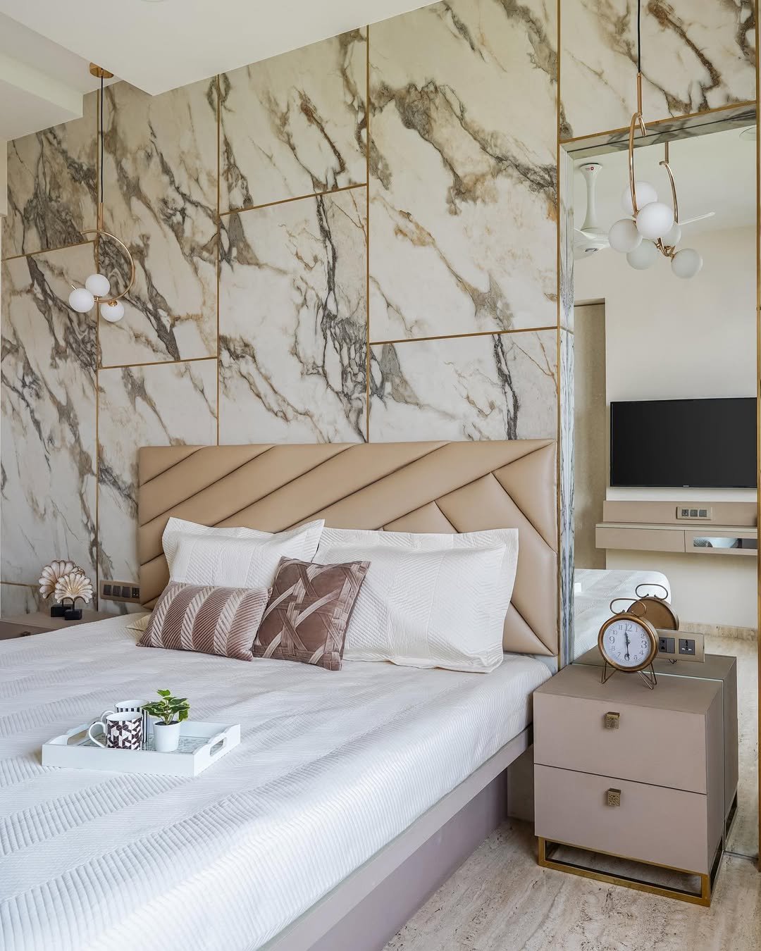 This one makes a statement the moment you walk in. That marble wall, framed with gold lines, adds structure and drama, while the neutral bedding keeps it from feeling too bold.