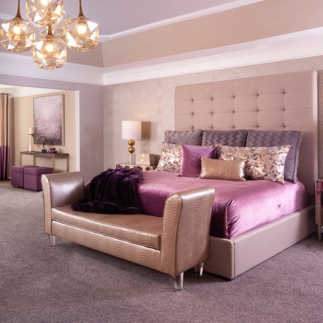 This room leans into softness with a little drama tucked underneath. Mauve, blush, and dusty plum build on each other in a way that feels plush and inviting, while those warm metallic accents catch the light just enough to elevate everything.