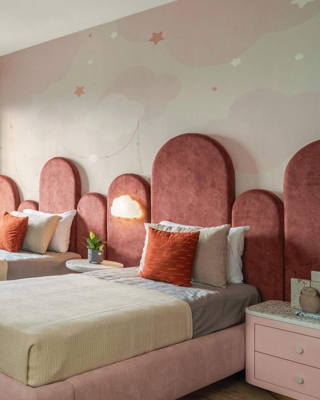 There’s a softness here that feels almost storybook. The rounded headboard panels, dusty rose tones, and those gentle cloud motifs create a space that feels dreamy without tipping into overly sweet.