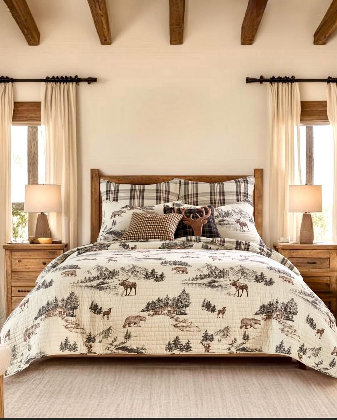 This palette tells a story the second you walk in. Warm woods, creamy whites, and those earthy brown patterns create a space that feels grounded and familiar, almost like a weekend cabin you never want to leave.