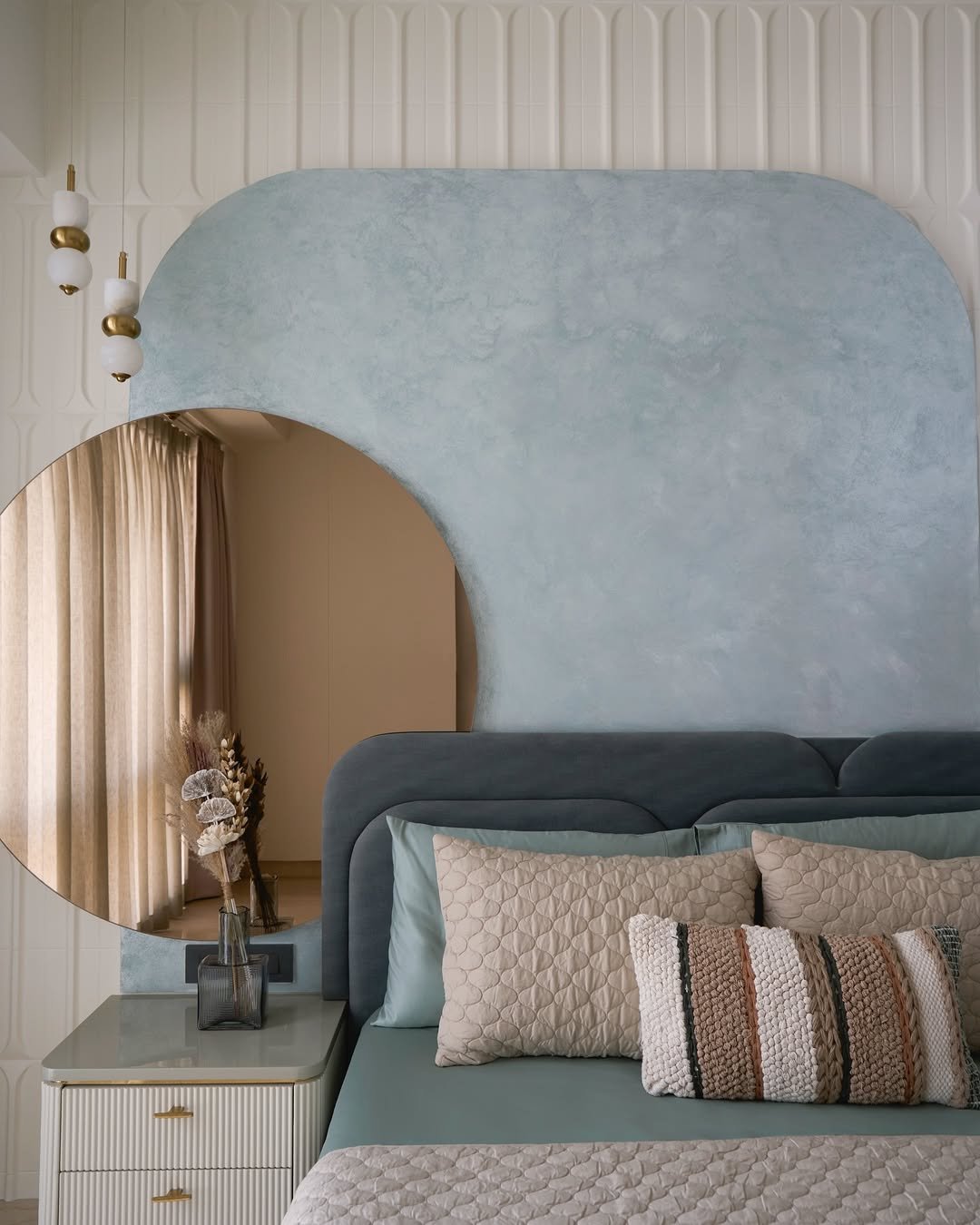 The curves here do all the talking. That oversized, sculptural headboard paired with soft blue tones creates a look that feels both modern and a little artistic.
