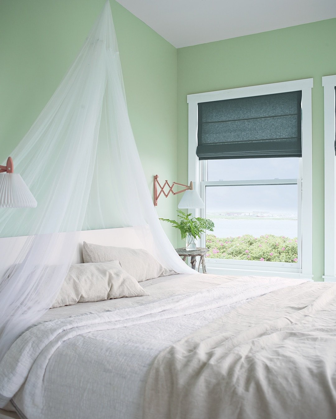 There’s a quiet ease to this room that feels like fresh air. The minty green walls paired with sheer white draping create a softness that almost floats.