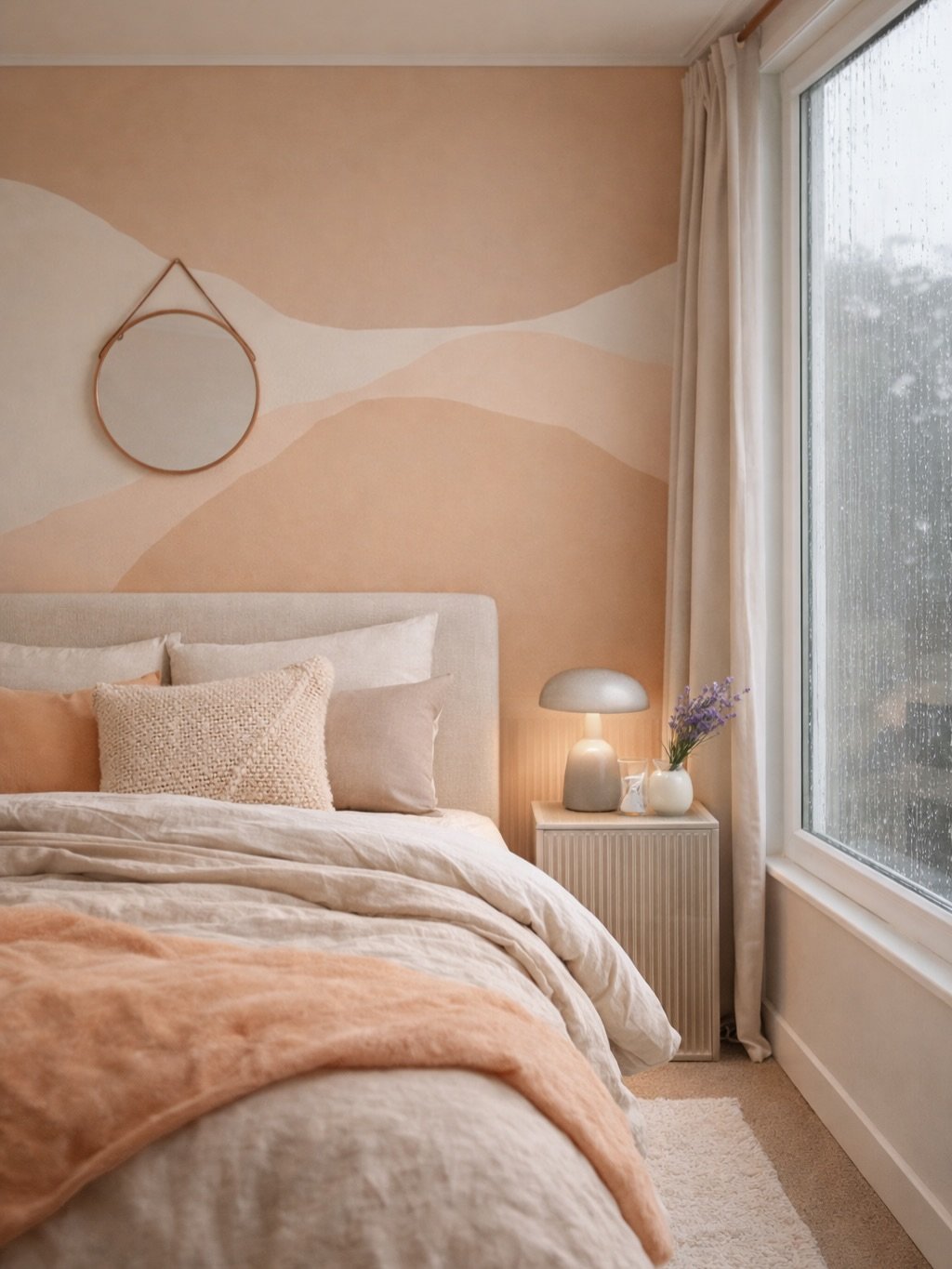 This room feels like waking up to filtered sunlight every day. Peachy walls, creamy linens, and that soft gradient mural create a gentle warmth that wraps around the space.