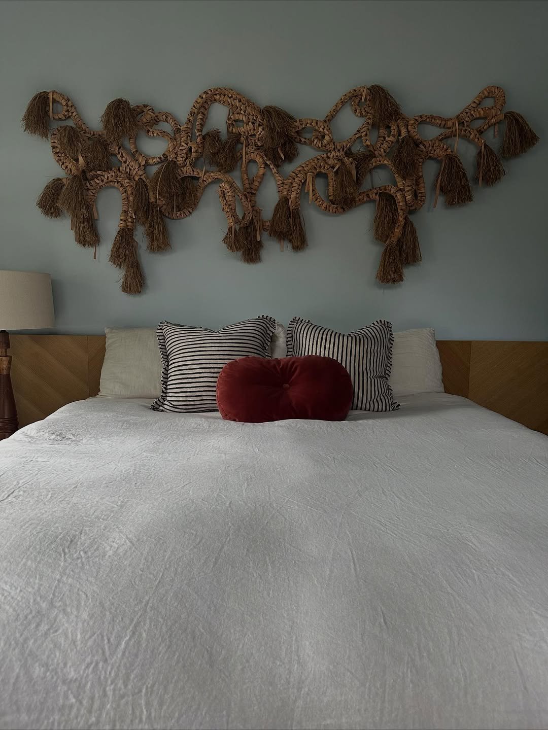 At first glance, it feels simple, almost quiet, but then your eye catches that sculptural wall piece and everything shifts. The woven texture adds movement against the soft blue wall, while the crisp white bedding keeps the whole space grounded.