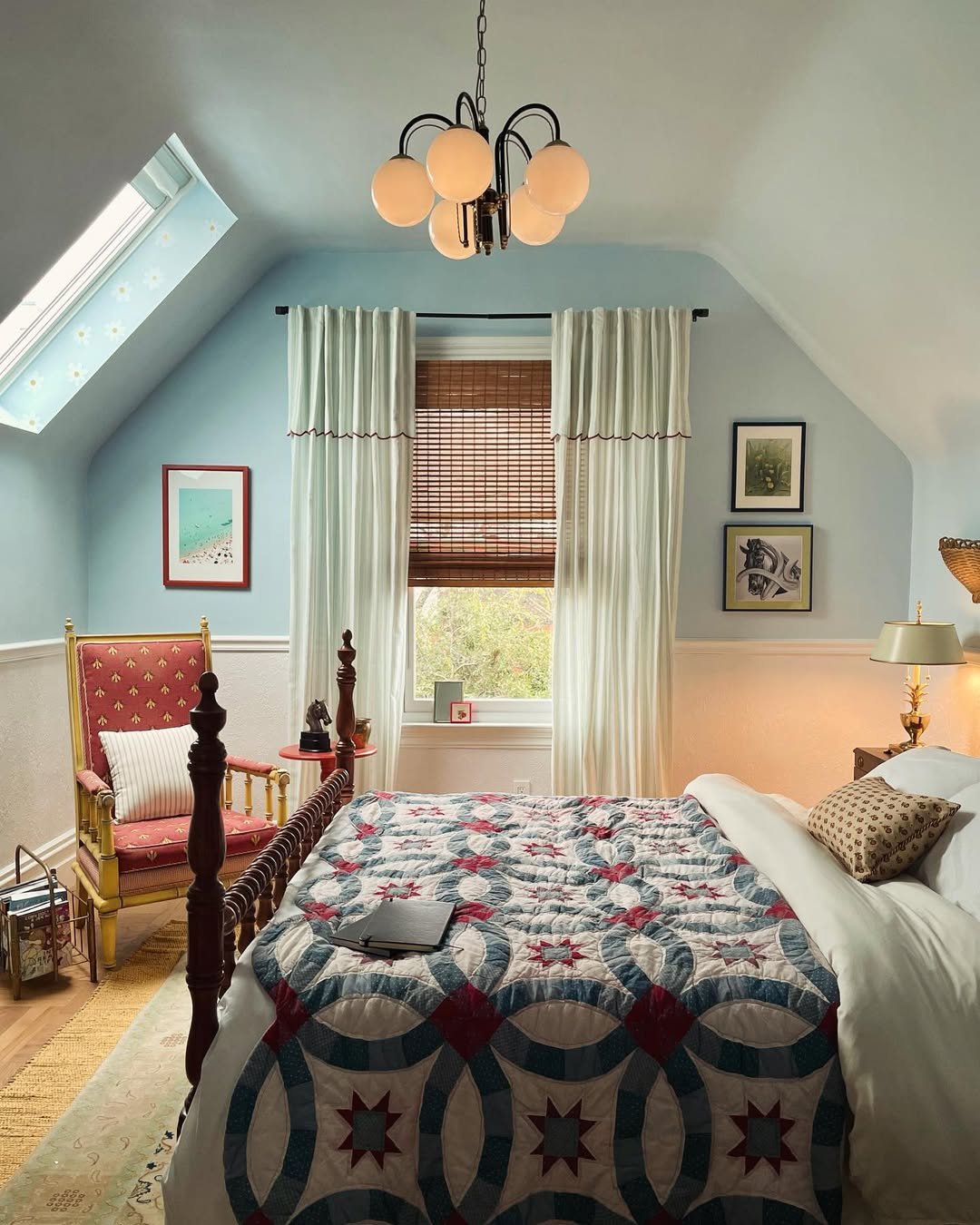 This space feels like a story. Soft blue walls meet a patchwork quilt and warm wood tones, creating a room that feels personal and nostalgic.
