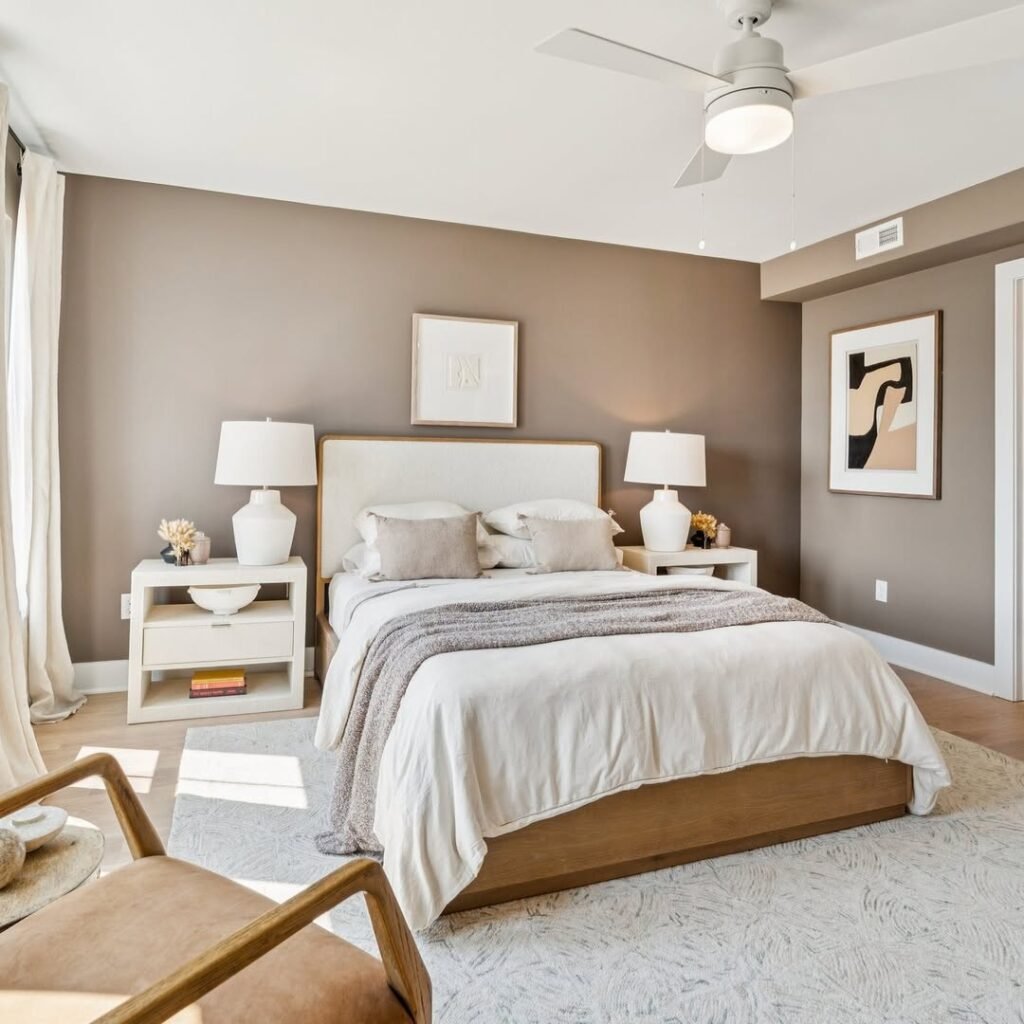 This is the kind of palette that never goes out of style. Soft taupe walls, creamy whites, and subtle wood tones create a space that feels clean, warm, and effortlessly put together.