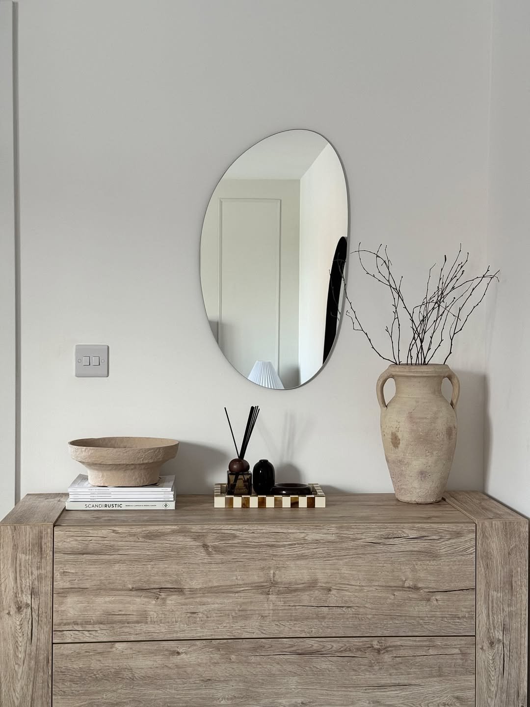 This mirror blends right into the palette, warm wood, soft beige, and layered textures that feel cohesive without matching too perfectly.