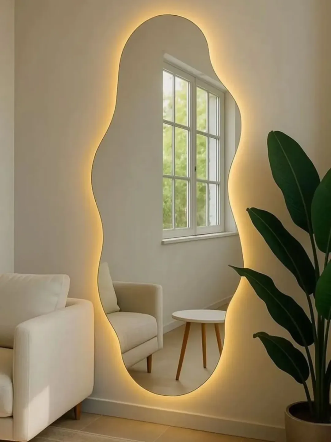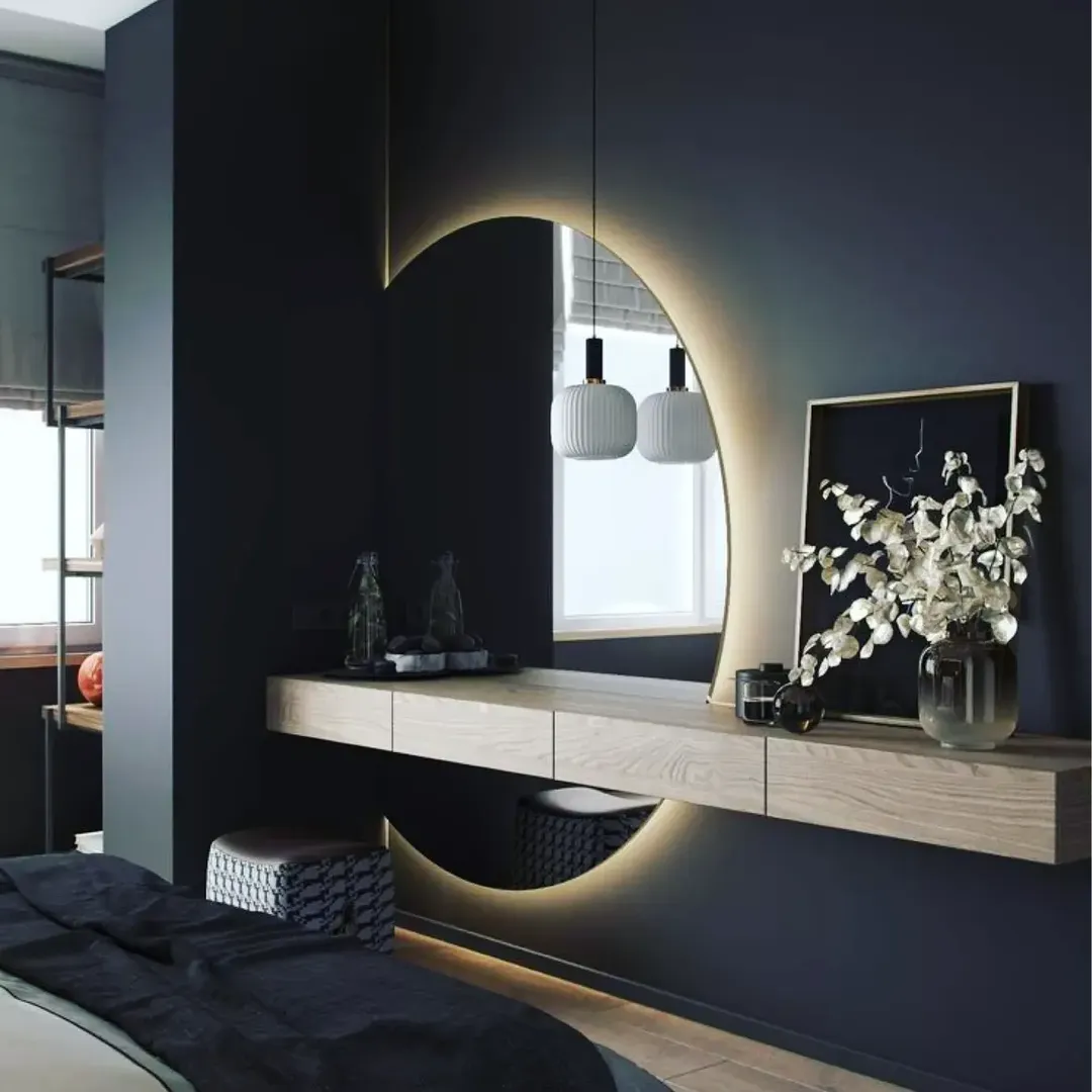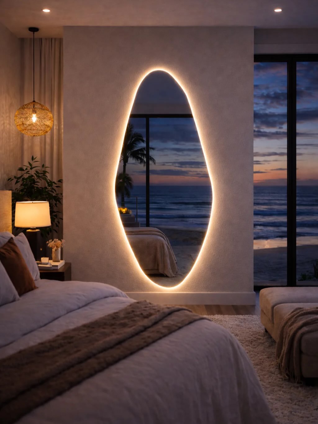 This mirror doesn’t just reflect the room, it captures a whole mood. The organic shape paired with that soft backlight creates a dreamy outline, especially against the ocean view beyond.