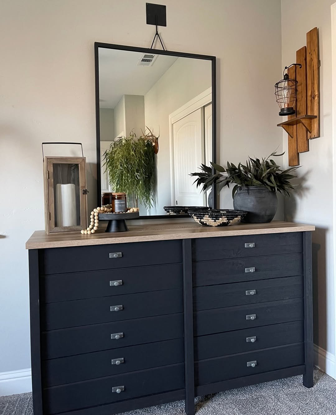 This corner feels grounded and familiar in the best way. The dark dresser, natural wood top, and simple rectangular mirror create a balanced mix of rustic and modern.