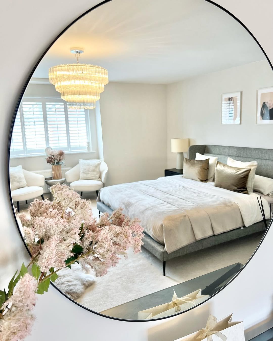 There’s a quiet elegance in this round mirror moment. It frames the entire bedroom like a vignette, catching the chandelier’s glow, the soft blush florals, and that perfectly layered bed in one seamless reflection.