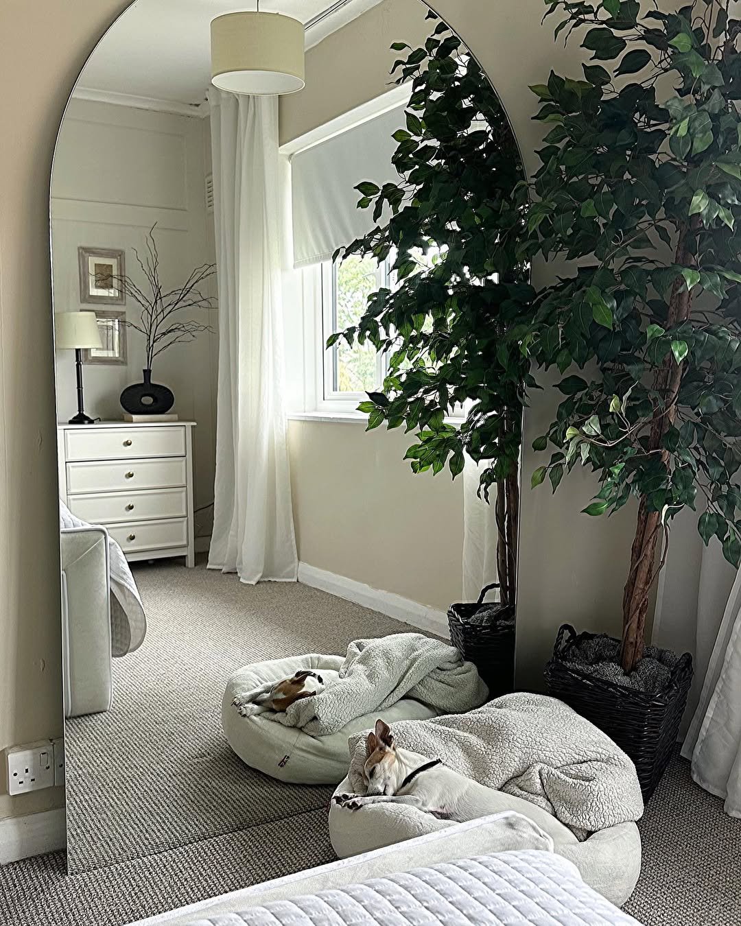 There’s something grounding about this setup. The arched mirror sits beside soft textiles and greenery, creating a layered, lived-in feel that’s instantly calming.