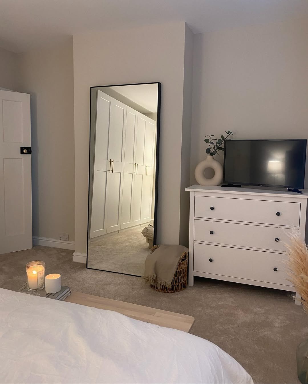 The soft neutrals, candlelight, and clean lines create a space that feels quiet and uncluttered. It’s the kind of bedroom that lets you exhale the moment you walk in.