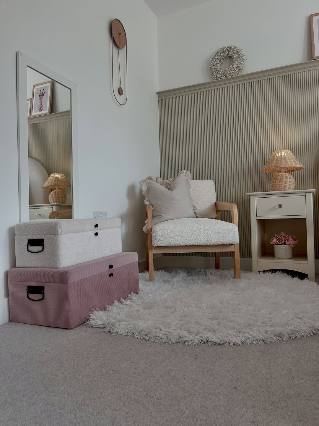 There’s a softness here that pulls you in instantly. The mirror tucked beside the boucle chair reflects warm lamplight and those layered textures, making the whole nook feel twice as inviting.