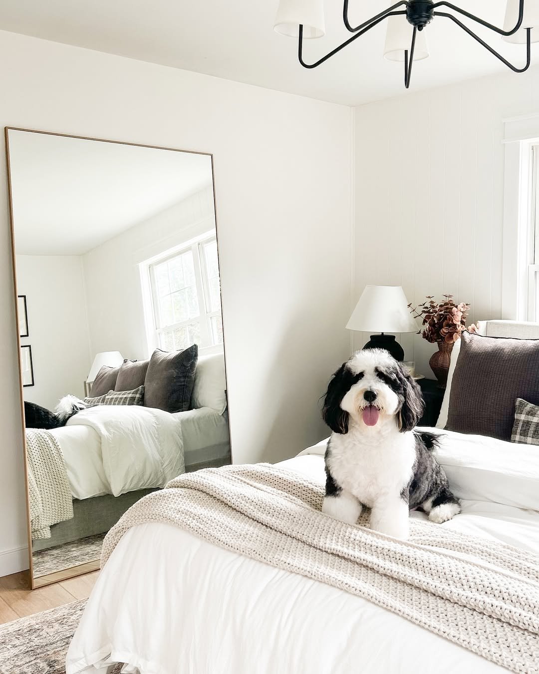 This is one of those spaces that feels lived in, in the best way. A simple full-length mirror leans casually against the wall, catching glimpses of soft bedding, layered pillows, and even a little personality from that four-legged guest.