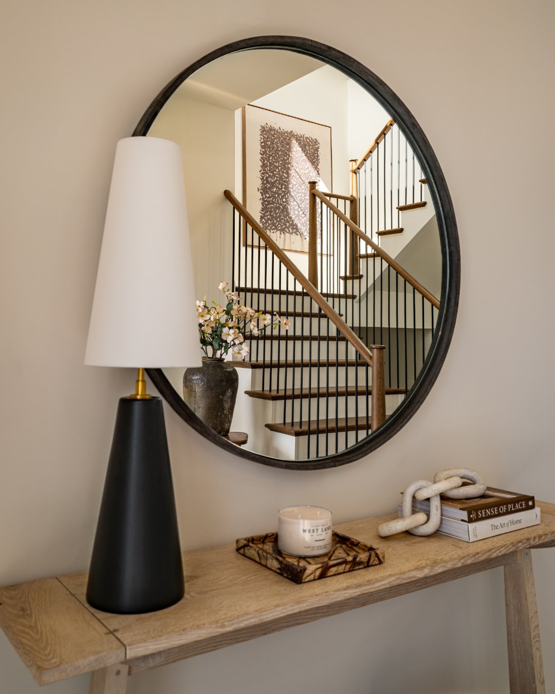 This is where styling meets storytelling. The round mirror reflects the staircase behind, adding depth while the console below anchors the space with warm wood and layered decor.