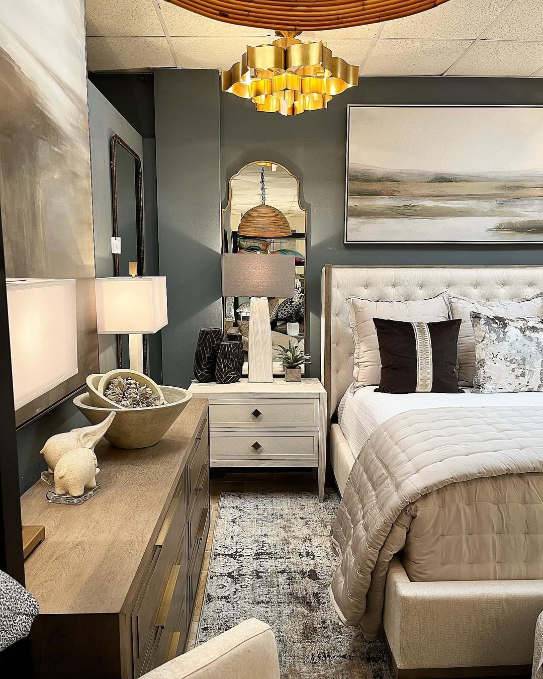 It’s a great example of contrast done right. If you’re working with darker tones, a large mirror helps open things up while still letting you keep that cozy, grounded vibe.