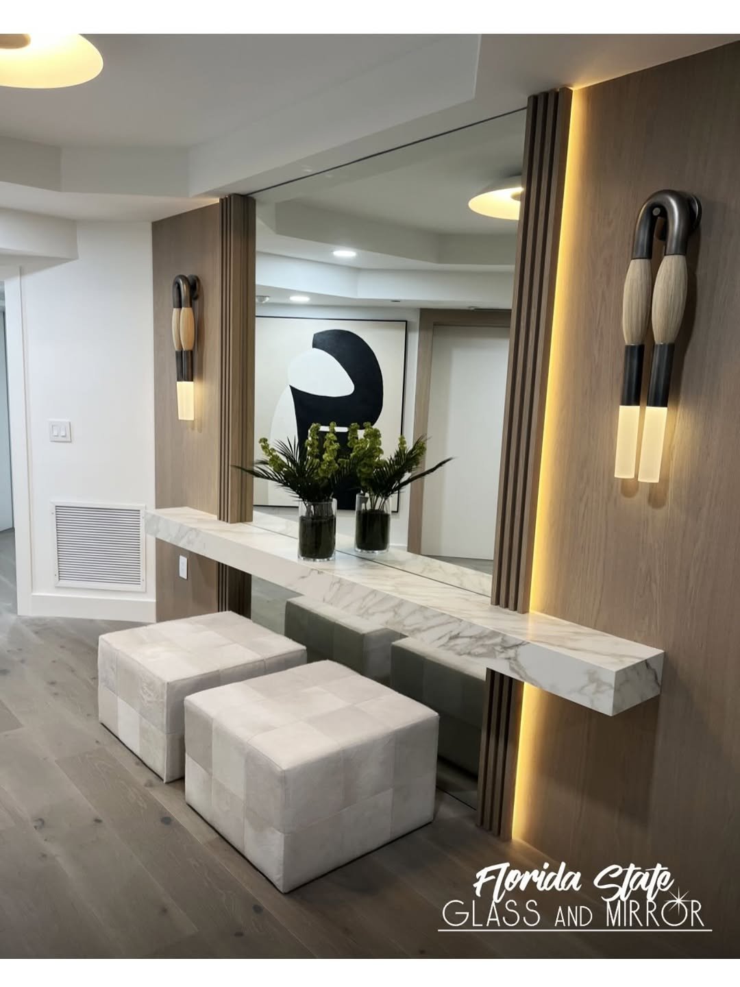 What really pulls it together is the lighting. Soft backlit strips create depth and glow without overpowering the space. If you’re designing a vanity wall, think beyond the mirror itself, layering materials like wood, stone, and light can turn a simple reflection into a full moment.