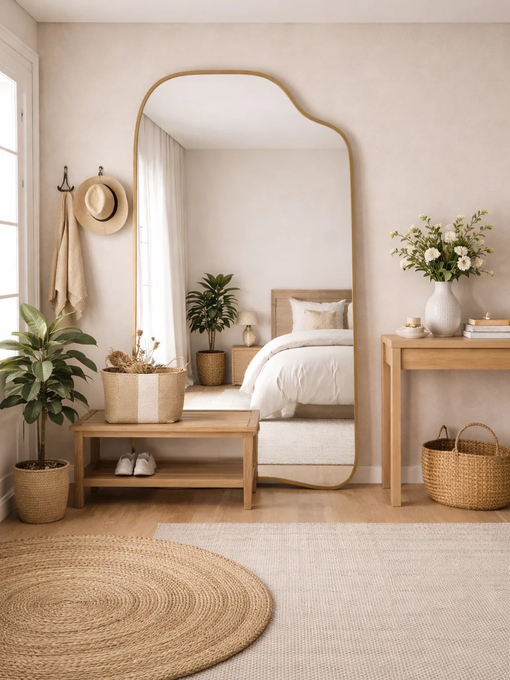 Clean lines, soft light, and a mirror that quietly expands the room. This full-length piece reflects the window and greenery, doubling the sense of space without adding visual clutter.