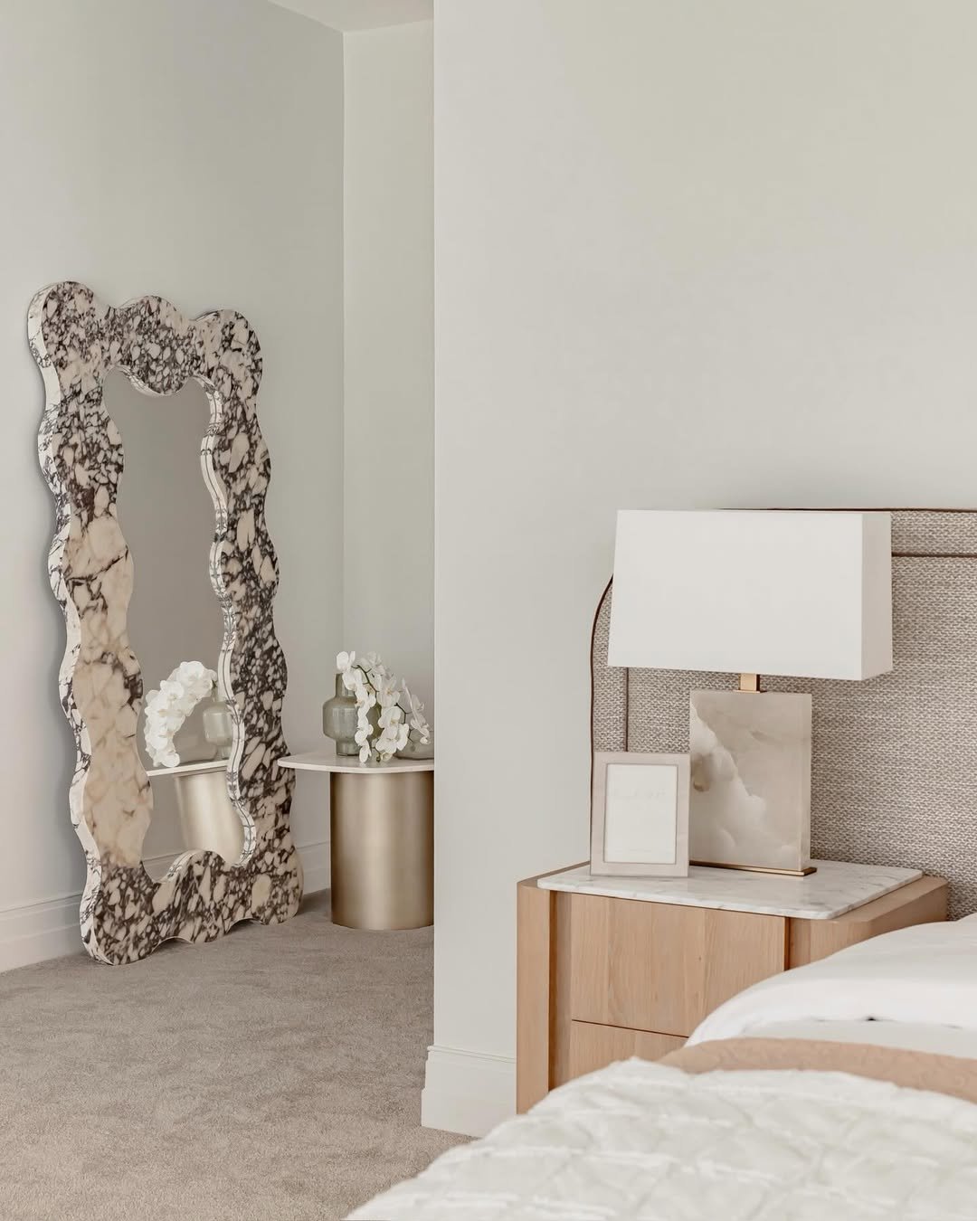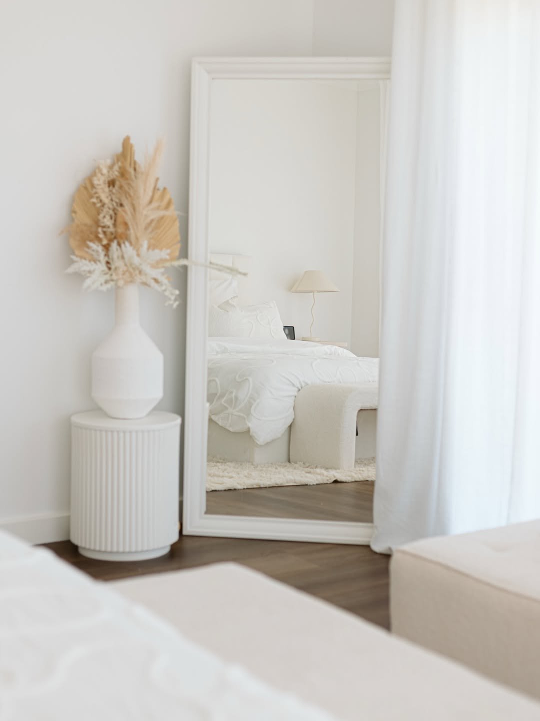 What makes this work is restraint. Everything stays within a creamy, tonal range, so the mirror doesn’t just reflect the room, it extends it. If you’re after that calm, gallery-like feel, keep your frame subtle and let shadows and textures do the storytelling.
