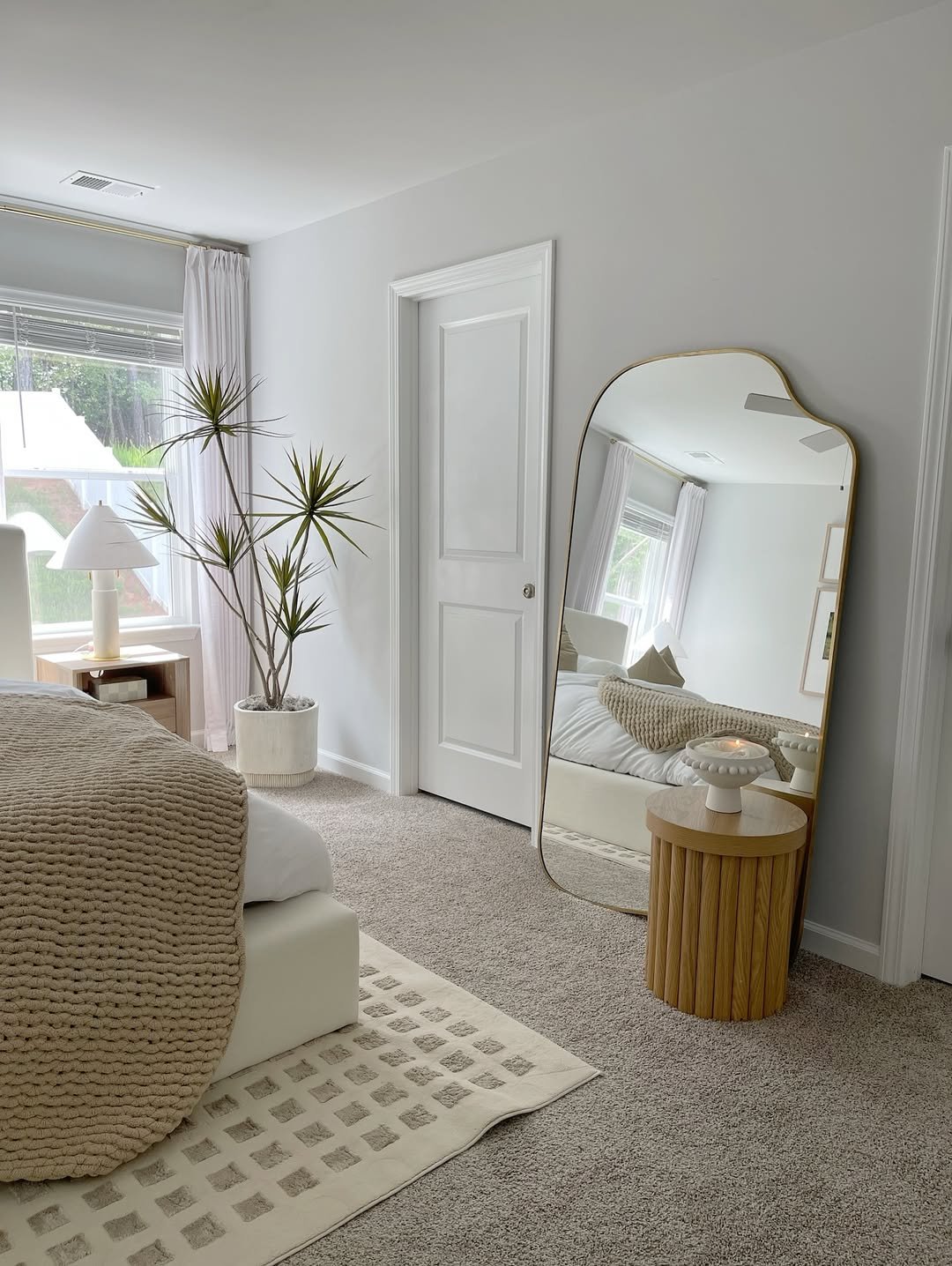 It’s all about balance. Pairing a simple mirror with textured layers like knit throws and boucle keeps the space from feeling flat, while still holding onto that serene, neutral mood.