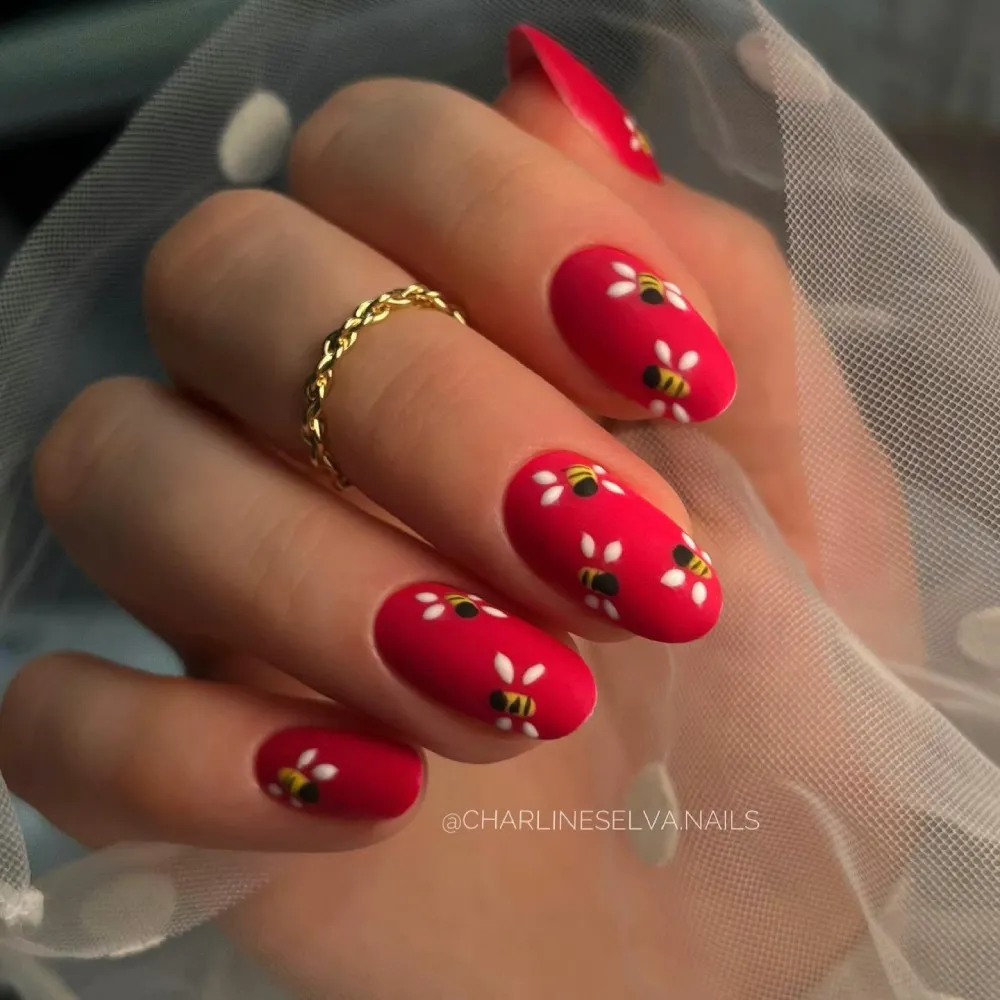 If bees hosted a garden party, this is what they’d wear. The vibrant red matte base instantly grabs attention, while the daisy-and-bee accents keep it playful and artsy.