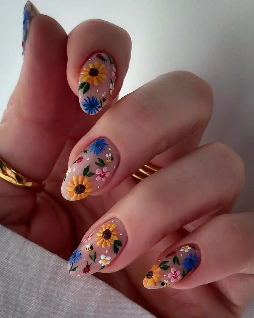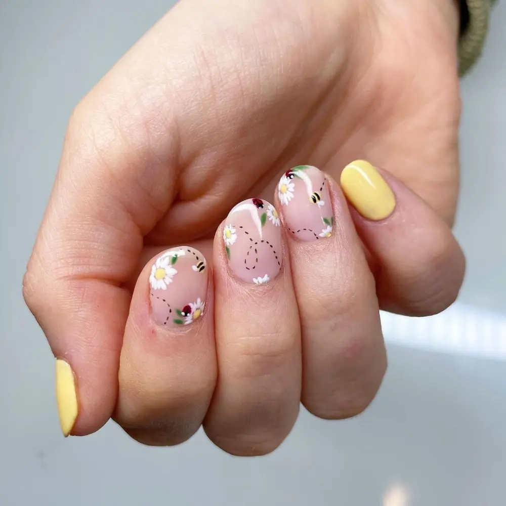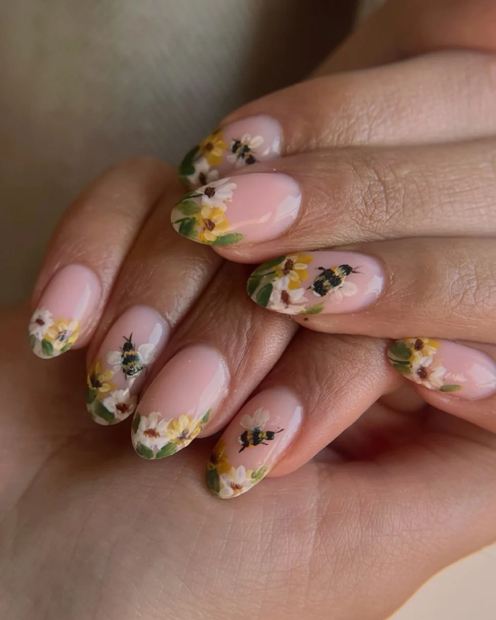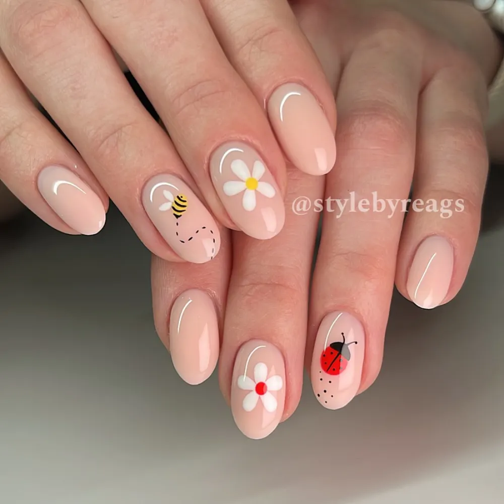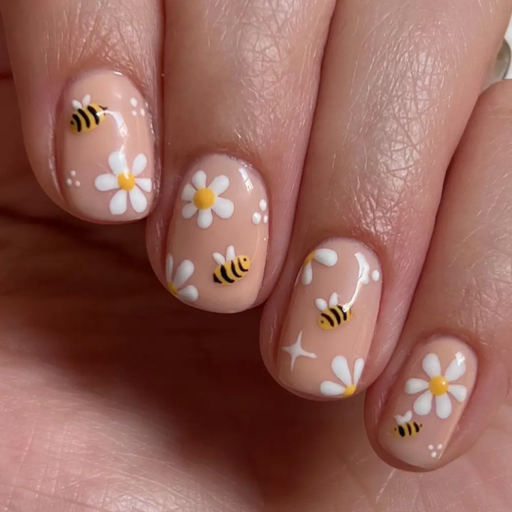 A classic nude base sets the stage here, letting those bold little bees and bright daisies pop like sunshine. The playful scale of the flowers makes this feel extra cheerful—almost like a mini garden party happening right on your nails.