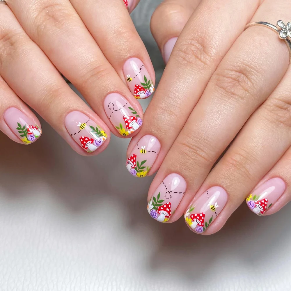 Here’s a full floral narrative on your fingertips—tiny mushrooms, pastel botanicals, and baby bees all woven together like illustrations from a whimsical storybook. The detailing is unreal, but still soft enough to feel wearable.