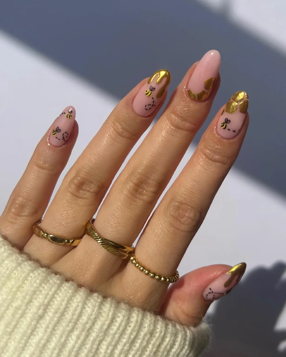This look leans into the luxe side of bee nails—those gold chrome drips? Pure honey-drip fantasy. The little dotted trails add just the right amount of whimsy, keeping it playful while still giving main-character energy.
