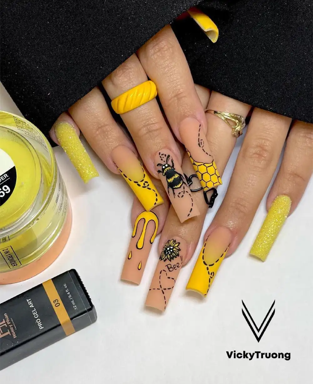 These nails come in hot with the full honey–bee fantasy. You’ve got melting drips, textured yellows, and a bold little bee that looks like it’s mid–flight plotting its next nectar mission. It’s playful but still super polished, the kind of set that makes people grab your hand mid-conversation.