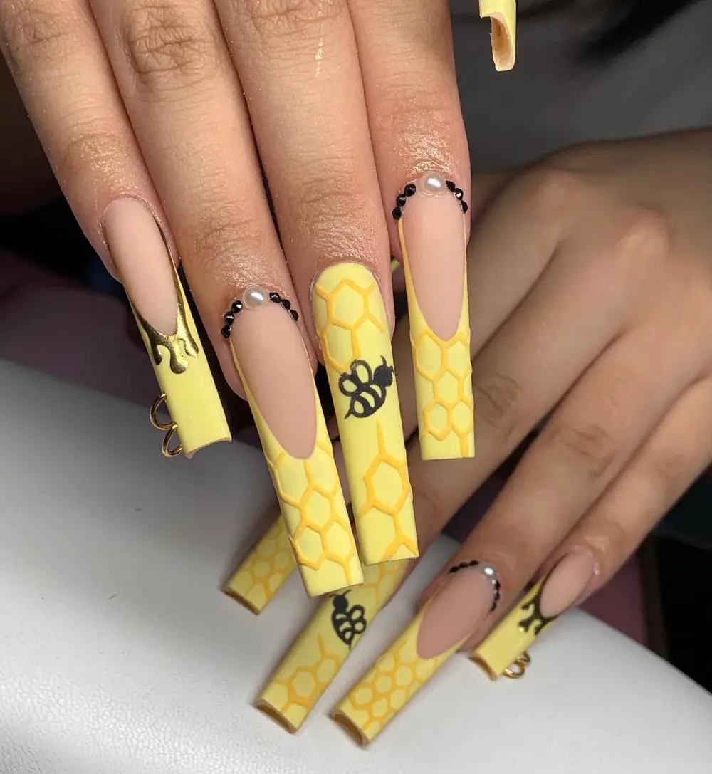 This set feels like the luxury version of bee nails—gold accents, honeycomb details, and the cutest metallic bee that looks like it’s wearing couture. The yellow tips add a sharp little pop without overpowering the softer nude base.