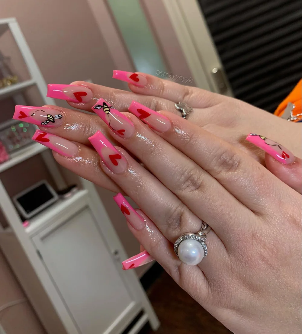 A pink French tip with floating hearts and tiny bees? The combo you didn’t know you needed. It’s flirty, quirky, and has just the right amount of sass — kind of like sending a risky text but with glitter.